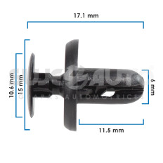 GRAPA DE PRESION NS SENTRA 07-12 MT ECLIPSE 09-12/ENDEAVOR 04-08 10-11/GALANT 07-12/LANCER 02-17/MIRAGE 97-02 14-15 17-20/MONTERO 01-06/OUTLANDER 03-20 SB FORESTER 98-21/IMPREZA 06-21/LEGACY 00-06/OUTBACK 10-21 00-06 15 Piezas Nylon Negro 6 15/64 17.1 43/64 11.5 29/64 10.6 27/64 15 19/32