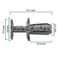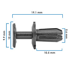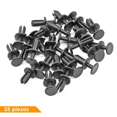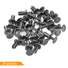 GRAPA DE PRESION VW GOLF 22-25 25 Piezas Nylon Negro Hoyo Mm: 5.6, 7/32 Largo Mm: 19.1, 3/4 10.5 13/32 Cabeza Superior Mm: 9.9, 25/64 Cabeza Inferior Mm: 10, 25/64 Sujeauto