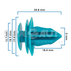 GRAPA DE TAPICERIA TY 4 RUNNER/AVALON 13-19/CAMRY 02-18/COROLLA 98-17/ECHO 00-05/HIGHLANDER 01-13/LAND CRUISER 08-18/RAV 4 06-18/SEQUOIA 01-05/SIENNA 04-10/SOLARA 04-08/TACOMA 08-12/TUNDRA 00-05/YARIS 08-16/MATRIX 03-08 50 Piezas Nylon Azul 8 X 8.5 5/16 X 21/64 Largo Mm: 20.2, 51/64 Tallo Mm: 14.