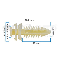 GRAPA DE TAPICERIA CV PICK UP 1988 50 Piezas Nylon Blanco 7.3 9/32 27.9 1 3/32 21 53/64 6.3 X 11.9 1/4 X 15/32 11.9 15/32 12. 8 1 /2 Sujeauto