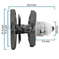 GRAPA DE TAPICERIA VW GOLF 22-25 25 Piezas Nylon Negro Hoyo Mm: 7.8, 5/16 23.4 59/64 Tallo Mm: 7.6, 19/64 Cabeza Superior Mm: 21.4, 27/32 19.6 49/64 Sujeauto